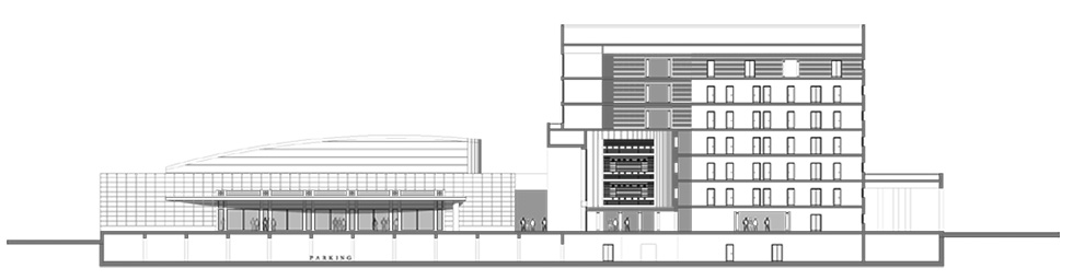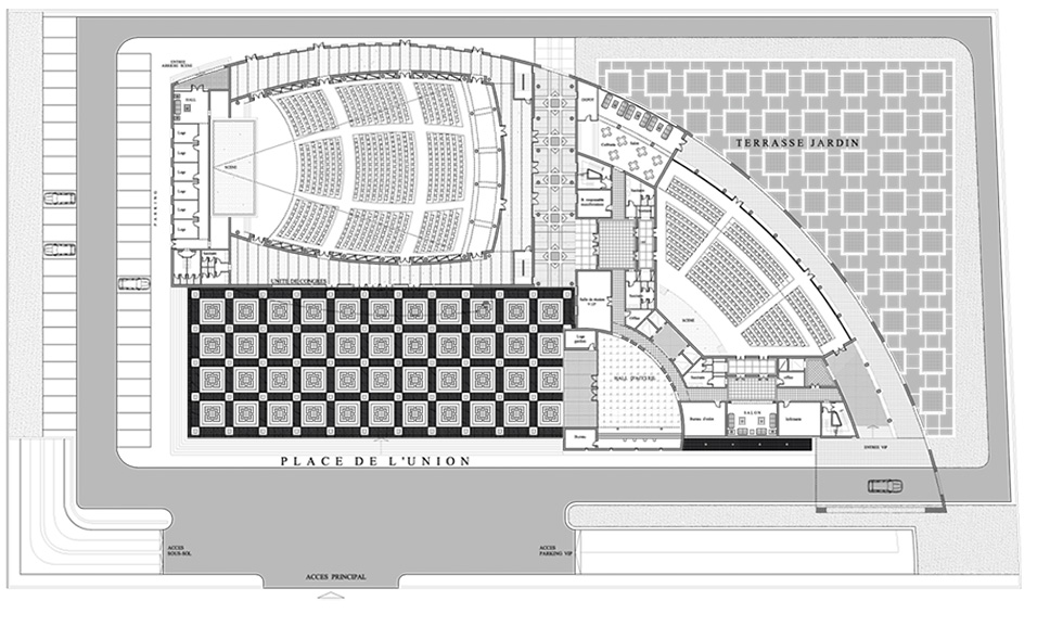 les deux entités s’articulent autour d’une grande place qui marque l’entrée du projet et constitue un lieu d’échanges et de rencontres. ainsi le parti retenu se traduit par un geste généreux, unificateur et dynamique symbole de consolidation et de flexibilité du processus productif.